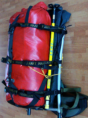 I use a sturdy frame backpack, combined with a waterproof bag of 60 liters. The system carries well and keeps your gear crispy dry, even after two weeks of persistant rain. I have even used the system as a floatationdevice to cross a river. The bag is attached to the frame with adjustable straps (home made) to carry any bag with appropriate size. You can also attach side bags, showed on on the ‘Clothes and Boots’ page. The bag can be placed directly into a canoe or kayak.