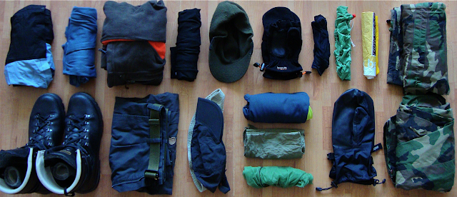 Heading into moderate or colder regions, I usually bring a windjacket, thermo sweater, thermo pants, hat, gloves, spare musquito hat, balaclava, plastic bags for wet clothes, and rainjacket – trousers and – mittens. What I wear are boots, socks, pants, belt, underwair, t-shirt. In my pockets I carry handkerchiefs, cap and a musquito hat. I prefer to wear high boots that are waterproof. In swampy northern regions rubber boots should be considered.