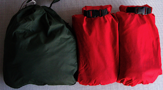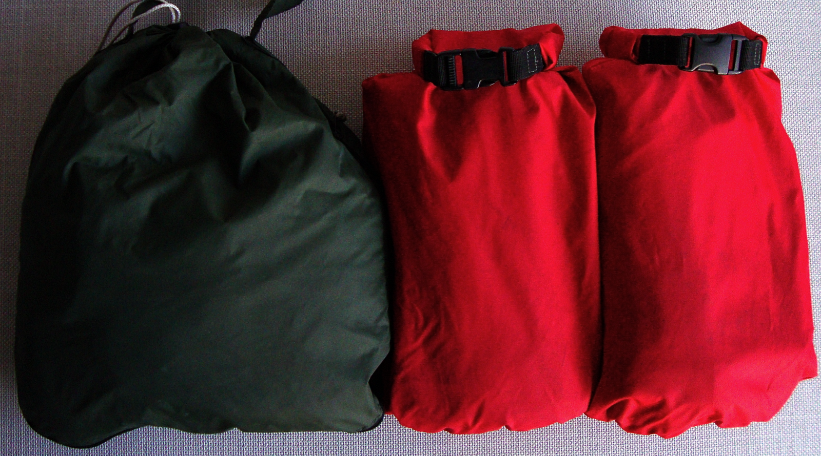 Rain trousers and jacket are stored in two waterproof sidebags for the backpack (red coloured, home made), placed at each side of the backpack. Other clothes are stowed in a clothes bag (green coloured , home made). A sweater can be stowed anywhere in the backpack.