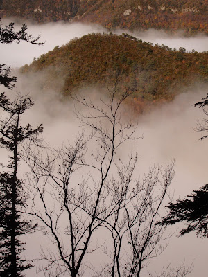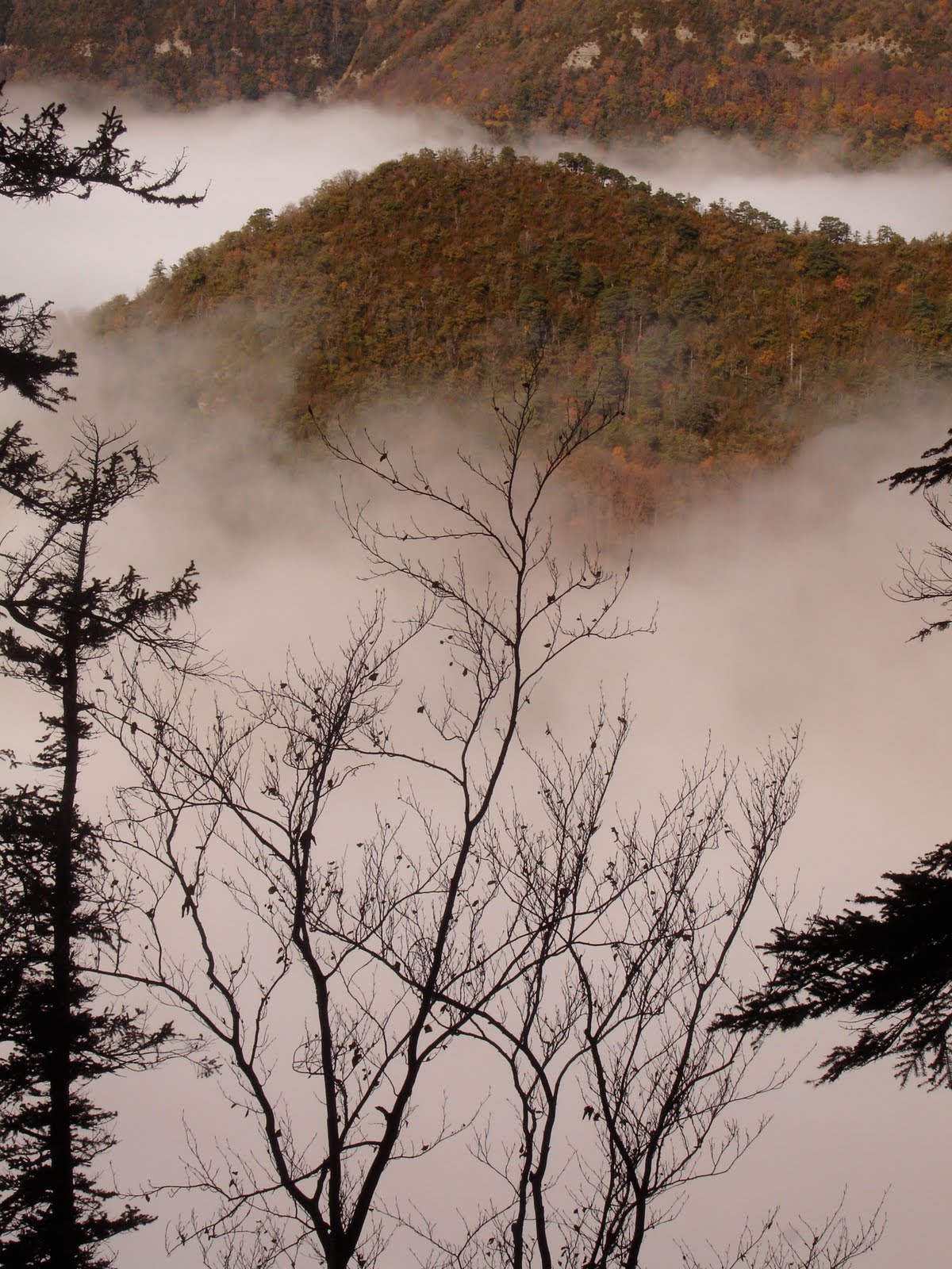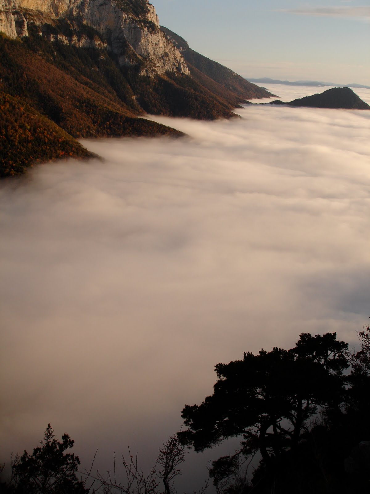 The forest was filled with a cool sunshine. I went further down the path to reach a track that goes all along the west edge of the plateau. Because water was not likely to be found for a considerable stretch, I went to the nearest source behind a little ridge called the Serre Reynier, but I could not find the right track and found water more down the valley where the road begins. I took a while to reach the upper path again. What a great view of the lower valley filled with clouds.